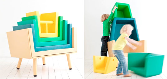 Die einzelnen Möbelelemente, die aus dem holländischen Designstudio Laurens Van Wieringen kommen, bestehen aus Schaumstoff, so kann beim hochheben und "stacken" (stapeln) auch kaum was passieren.