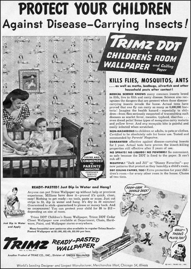 Eine recht interessante Werbeeinschaltung aus dem Jahre 1947. Bewroben wir eine Wandtapete die anhand "wissenschaftlicher" Erkenntnise insektenabweisend sein soll. Schließlich tragen Insekten ja Krankheiten mit sich und so schlägt man hier gleich zwei Fliegen mit dieser Kinderzimmerdekoration mit Disneymotiven.